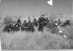 Troops discussing tactics in field as the unit trained in advance to contact maneuvers. Officer standing with back to camera. P1648