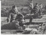 Troops firing the Bren Gun with Gas Mask. Training in England. Capt Darling standing. (Prior accession No. P1723)