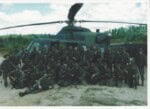 Platoon of 48th Highlanders poses in front of a helicopter at Exercise Stalwart Guardian in Petawawa, Ontario. (prior accession No. P2052)