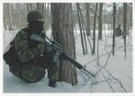 Pte Graeme Brown, 48th Highlander wearing a balaclava kneels behind a tree in the winter while at the ready as he provides security for the search party during the joint …