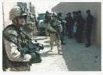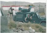 Close up of a 48th Highlander, wearing helmet and goggles as part of Task Force 32, guards the front gate of Forward Observation Base during Operation Steadfast. (Prior accession No. …