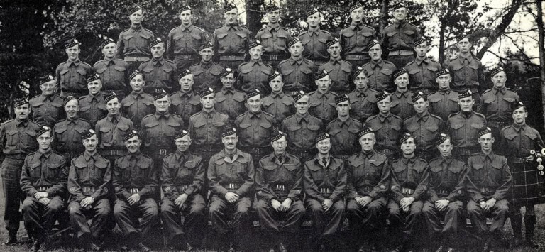 In early February he volunteered for action in North Africa with the British Army and joined the Argyll and Sutherland Highlanders in the 78th Division. In North Africa he was wounded (type of wound not in our records) and then returned to the 48th Highlanders on 11 April. On his return he came down with malaria, another “experience” from North Africa. On 14 April he participated in a talk to the 48th Officers, relating his battlefield actions and learnings. Our regimental history “Dileas” has a picture of the WOs and Sgts taken in the early spring of 1943 and CSM Stoutley is in the front row.