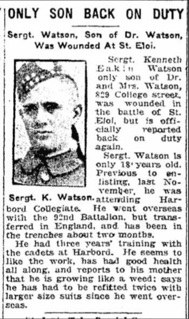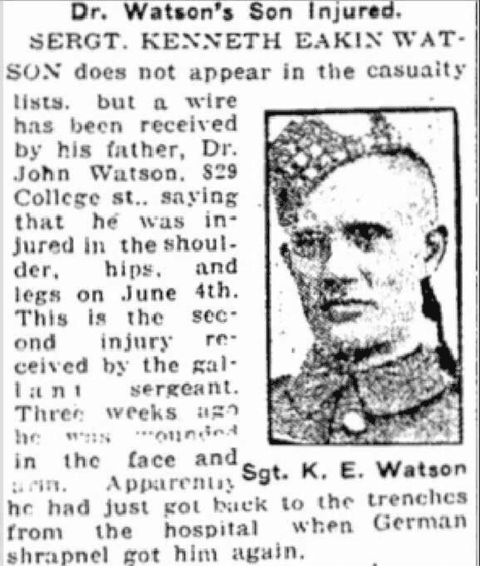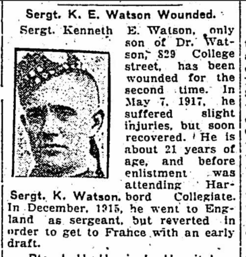Kenneth Eakin Watson attested on 31 Aug 1915 with the 92nd Battalion 48th Highlanders. Once in England he was transferred to the 15th Battalion, 48th Highlanders on 16 March 1916. Watson had been a cadet at Harbord Collegiate in Toronto for 3 years and became a Sergeant in the 92nd Battalion. His medical records show he had a tattoo of the 48th Highlanders badge. He reverted to Private to join the 15th Battalion. He was wounded three times in battle – on 29 April 1916 he suffered a slight wound and returned to duty; on 3 June 1916 we was wounded by shrapnel to the chest, shoulder, hips and legs and was sent to hospital. After 8 months he returned to the 15th Battalion. On 8 August 1918 he was wounded again in the right arm by a bullet which fractured the bone. Following hospital he was transferred back to Canada and was discharged.