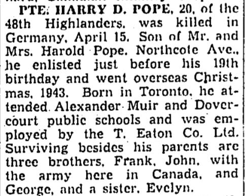 Harry Douglas Pope was born May 18th 1924 in Toronto. He lived a few blocks away from Trinity Bellwood’s Park at 148 Northcote Ave Toronto Ontario. The school he attended was Muri and Dovercourt Public schools. Harrys official enlistment date to the Canadian army as an infantry man was June 9th 1943 at the age of 19. He had some experience in the Royal Canadian Army Service Corps from April 16th 1942 to June 8th 1943, this being found on his attestation papers. This unit was an administrative and transport corps of the Canadian Army, it was established in the Non-Permanent Active Militia in 1901 and in the Permanent Active Militia in 1903.. At the time of his enlistment and deployment to the European theatre Pte Pope was not married and his only next of kin listed was his mother, Mrs Evelyn Pope. His official trade in his civilian life was as a shipper and had experience as a bread wrapper. Pte Pope did not attend high school or any college or university before enlisting into the army.