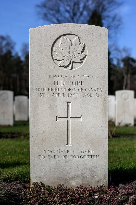 Pte Pope was killed April 15th 1945, on the 3rd day of Operation CANNONSHOT. At this stage of the operation C and D Coys moved against entrenched enemy positions in Apeldoorn’s outskirts, supported by tanks, targeting snipers in elevated positions. It appears that Pte. Pope was part of C Coy as they were the only Coy to send back 45 POWs. Unfortunately, it is not specified how Pte Pope was killed. He was temporarily buried in the town of Wilp located SE of Apeldoorn. His body was moved to Holten Cemetery sometime in the summer of 1946. His mother chose the personal inscription for his headstone “Too Dearly Loved To Ever Be Forgotten”.