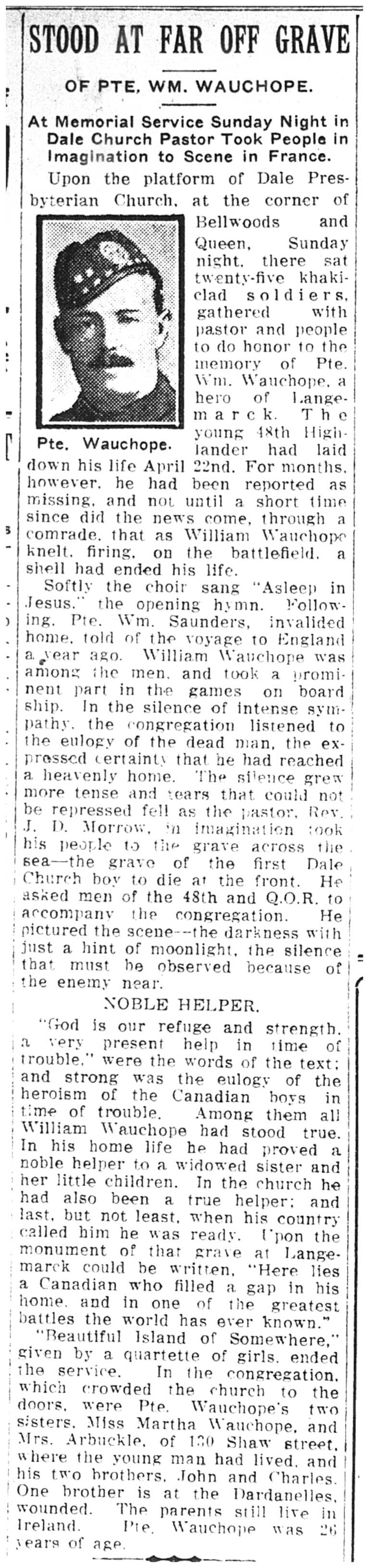 NOK: Son of James and Eliza Jane Wauchope, of Gortfad, Castlefinn, Co. Donegal, Ireland.