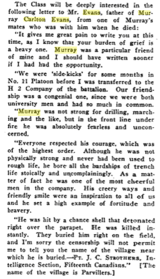 John Cannon Stothers notes his relationship with Murray in a letter to home, dated January 12th, 1918: