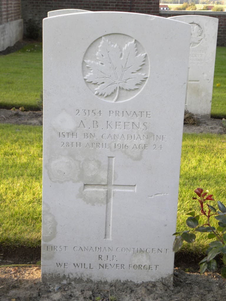 He was part of one of the reinforcement drafts to the 15th Battalion that arrived in early May 1915 to replace the losses the battalion had suffered at 2nd Ypres in April. He was posted to No. 3 Company, fought at Festubert in late May and was with the battalion in the Ploegsteert-Hill 60 area during the fall, winter and spring of 1915-1916. He was another one of the casualties from the action at International Trench near Hill 60 when on April 28th he suffered a fatal GSW to the head. Like those other Highlanders KIA during that engagement, Private Keens was buried in Woods Cemetery.