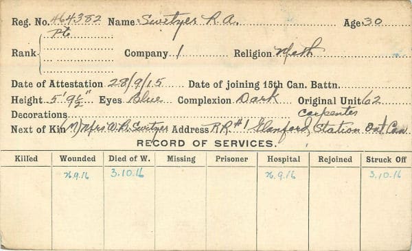 NOK: Son of William B. and Elizabeth Switzer, of Binbrook, Ontario.