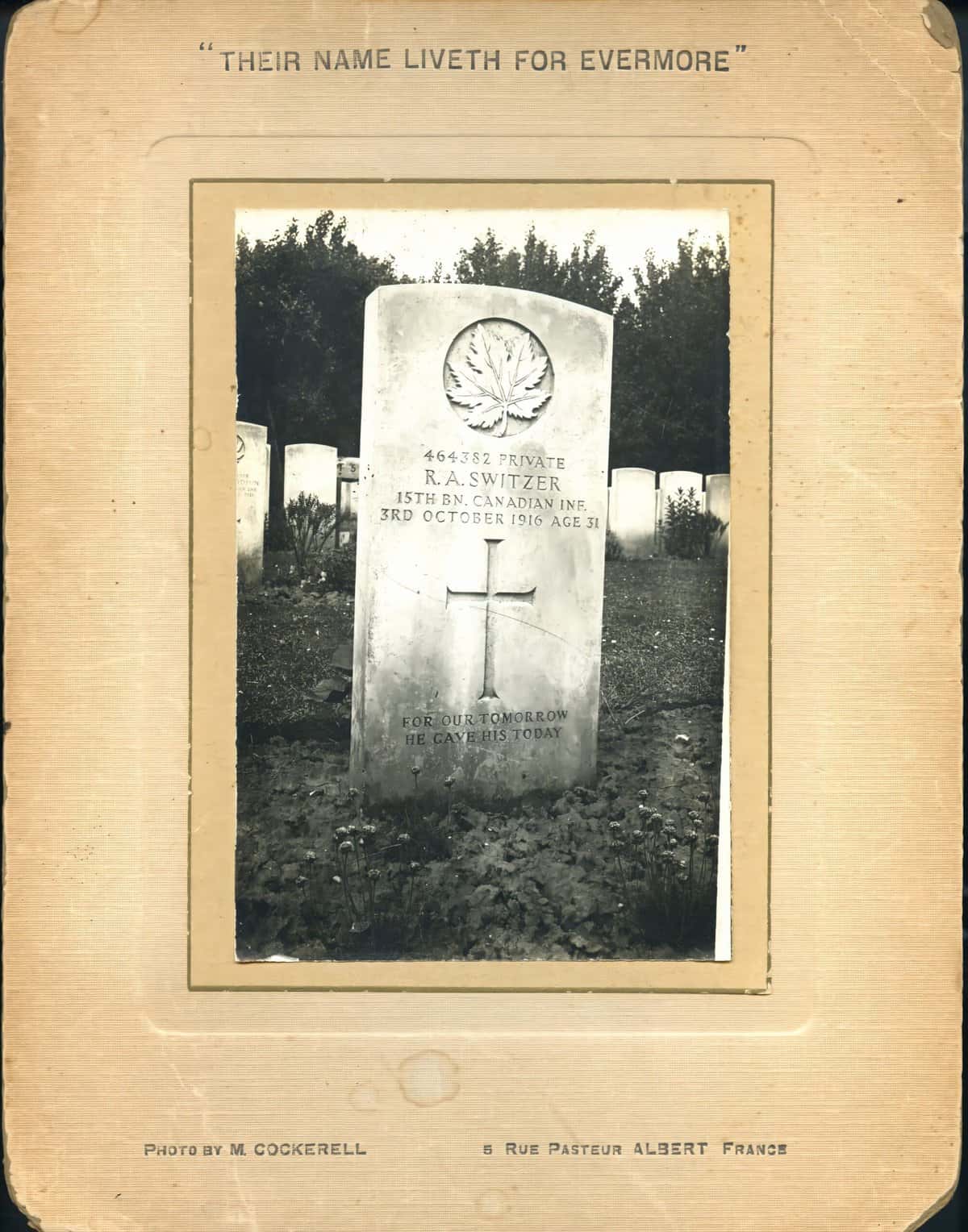 Once the permanent gravestone was laid, Arthur Switzer's family back in Binbrook, Ontario received this photograph.