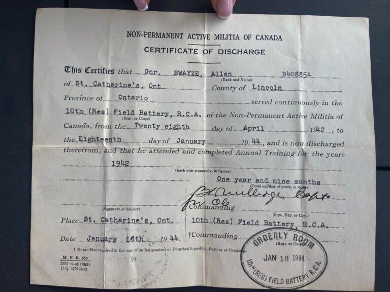 Before enlisting for overseas Swayze served in the militia in St. Catherines, Ontario for 2 years from 28 April 1942 to 18 January 1944 having joined the 10th (Res) Field Battery, Royal Canadian Artillery while underage. His service number with 10th Field was B408854.