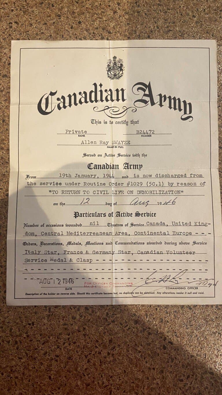 After the war Swayze was a member of Legion Branch 24, VA#7383896. Swayze was born May 7, 1925 and died in St. Catherines, Ontario on June 17, 2023 at the age of 99.