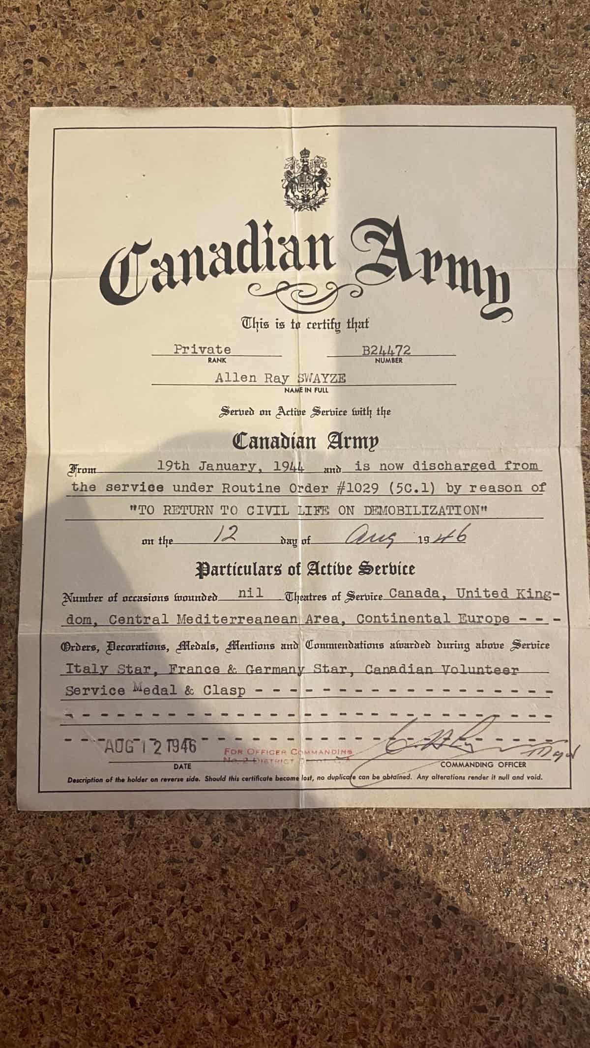 Before enlisting for overseas Swayze served in the militia in St. Catherines, Ontario for 2 years from 28 April 1942 to 18 January 1944 having joined the 10th (Res) Field Battery, Royal Canadian Artillery while underage. His service number with 10th Field was B408854.